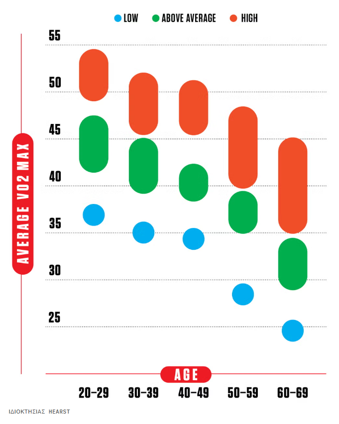 « ΑΝ ΕΠΡΕΠΕ να διαλέξω έναν αριθμό για να μετρήσω την πιθανότητα κάποιος να ζήσει πολλά χρόνια και καλά, δεν θα προτιμούσα τίποτα από τη μέγιστη πρόσληψη οξυγόνου (VO2 max),» λέει ο Aaron L. Baggish, MD, ο οποίος έβαλε την καρδιαγγειακή απόδοση στο επίκεντρο της Ιατρικής Σχολής του Χάρβαρντ. Η Αμερικανική Καρδιολογική Εταιρεία κατατάσσει πλέον τη μέγιστη πρόσληψη οξυγόνου (VO2 max) ως ζωτικό σημάδι, στο ίδιο επίπεδο με τον σφυγμό και την αρτηριακή σας πίεση. Ένας χαμηλός αριθμός μπορεί ακόμη και να αποτελεί πιο σοβαρό παράγοντα κινδύνου για θάνατο από καρδιαγγειακά νοσήματα από τους παραδοσιακούς αριθμούς, όπως η υψηλή αρτηριακή πίεση, η υψηλή χοληστερόλη, ο διαβήτης τύπου 2 και το κάπνισμα.